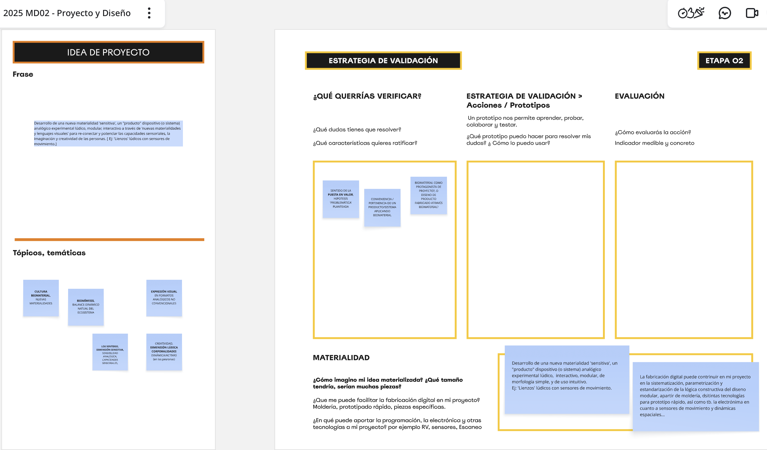 En un encuadre sobre el proceso de diseño y nuevas etapas de avance, las dinámicas prácticas buscaron darle continuidad al proceso creativo de proyecto final a desarrollar, y reflexionar sobre distintas dimensiones de proceso que enriquecerán la investigación y madurarán la conceptualización e ideación del proyecto (propuesta idea y valor, su contexto, referentes temáticos, intervenciones-acciones diseño, prototipado-estrategia validación, etc.) desarrollándose de la siguiente forma: