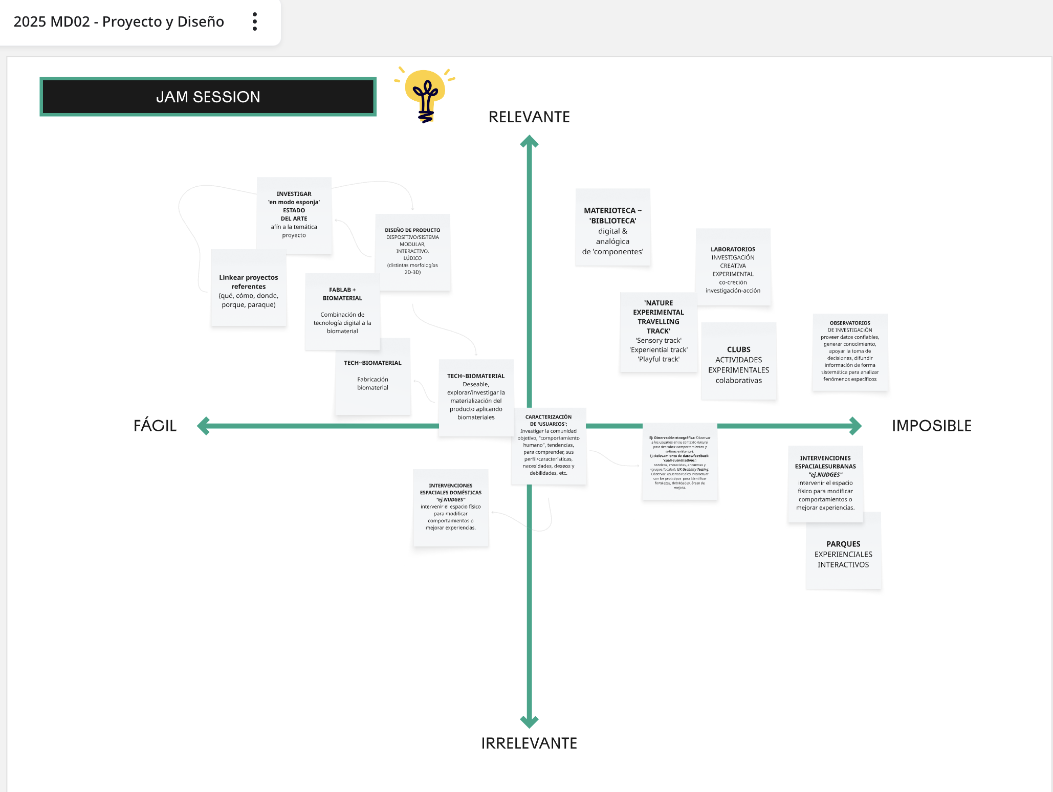 De forma individual la ‘Jam Session’ se focalizó en la generación de ideas vinculadas a la temática de proyecto bocetada hasta el momento, identificando de forma libre/espontánea ciertas intervenciones/acciones de diseño situadas en un contexto específico. El objetivo es ir involucrando ese contexto (actores/usuarios potenciales, problemáticas, situaciones disparadoras, etc) que comenzamos a mapear y valorar aquellas acciones que podríamos implementar para validando y definir nuestro proyecto, ingresando para el avance del proceso en la fase de prototipado y encauzando poco a poco hacia una fase de convergencia.
