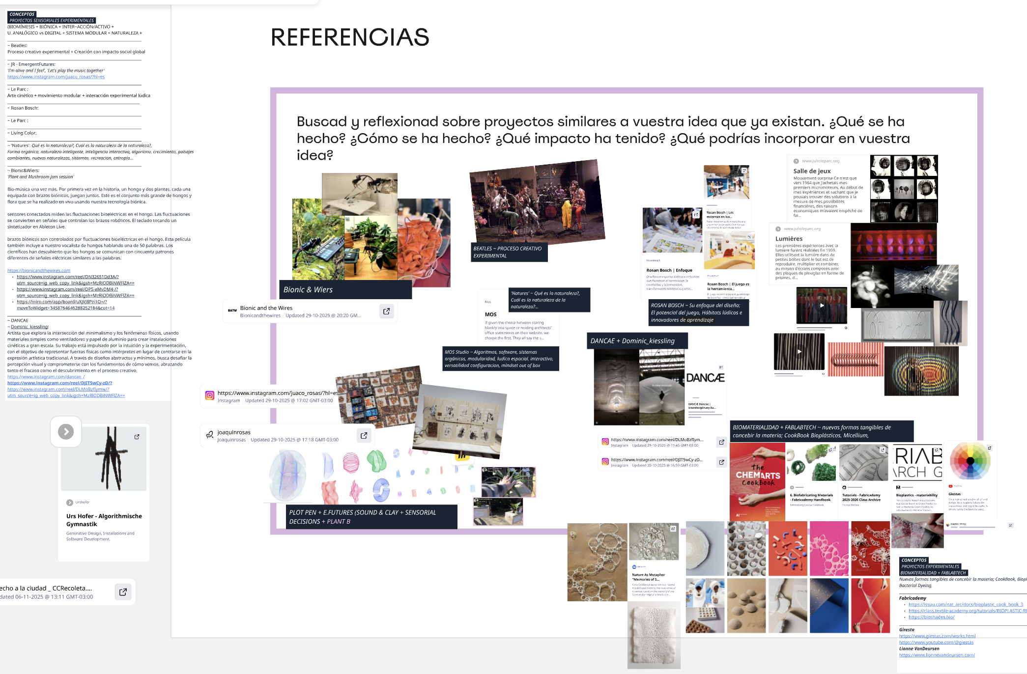 En este desafío de construcción creativa me encuentro aún explorando y en este sentido enriquecí la propuesta proyectual relevando referentes bajo un denominador común PROYECTOS SENSORIALES EXPERIMENTALES por así decirlo; Proyectos disparadores/inspiradores que se identifican con la impronta/esencia de mi ‘concepto fuerza’ de proyecto. En esta línea se buscó reflexionar sobre nuestra propuesta proyectual, identificando sus claves identitarias, analizando su impacto y propuesta de valor que los definen (qué, cómo, dónde, para qué, etc).