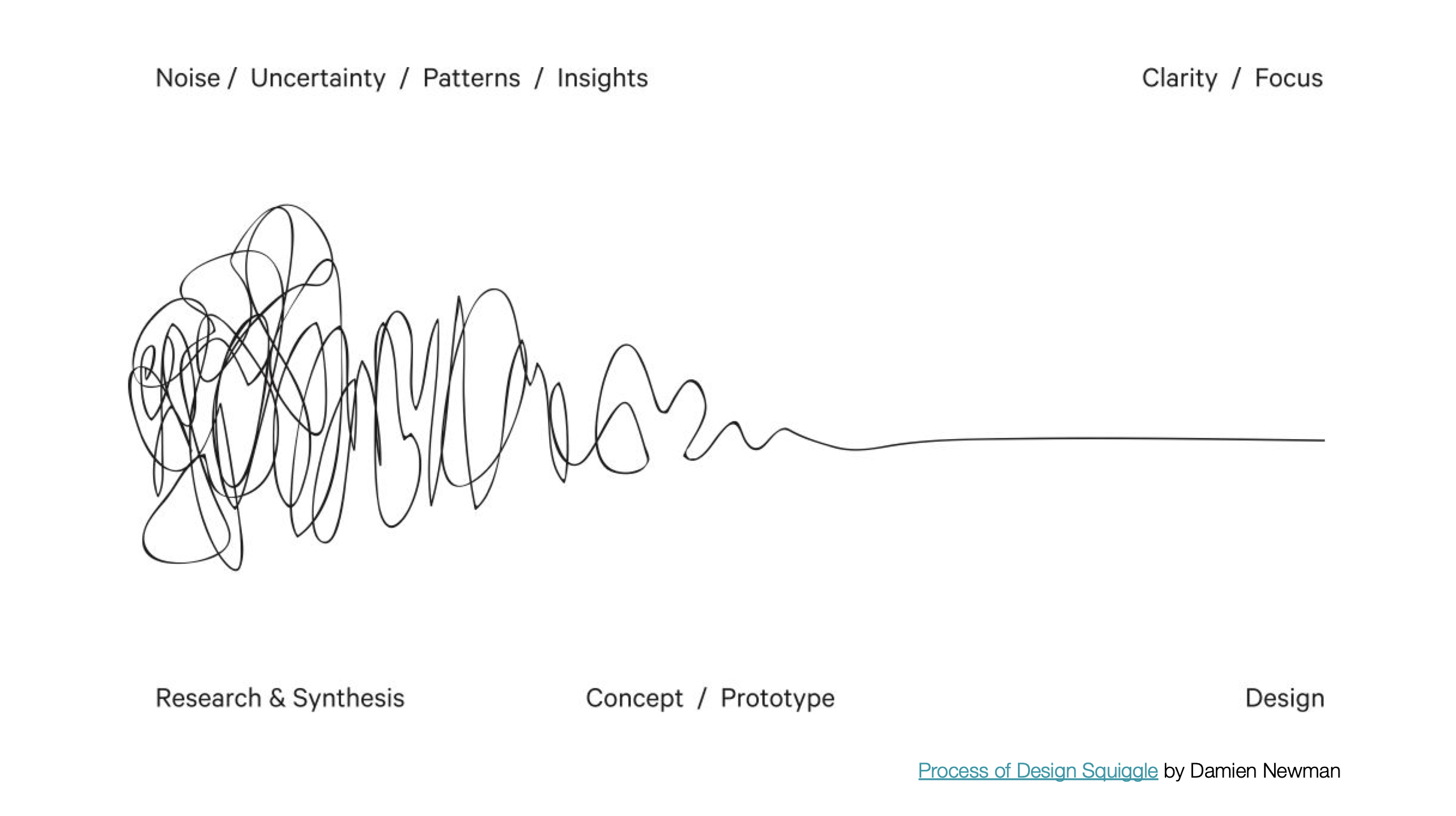 ❝ […] El viaje de investigación, descubrimiento de ideas, generación de conceptos creativos, iteración de prototipos y, finalmente, concluir en una sola solución diseñada.❞ + info ~ Process of Design Squiggle