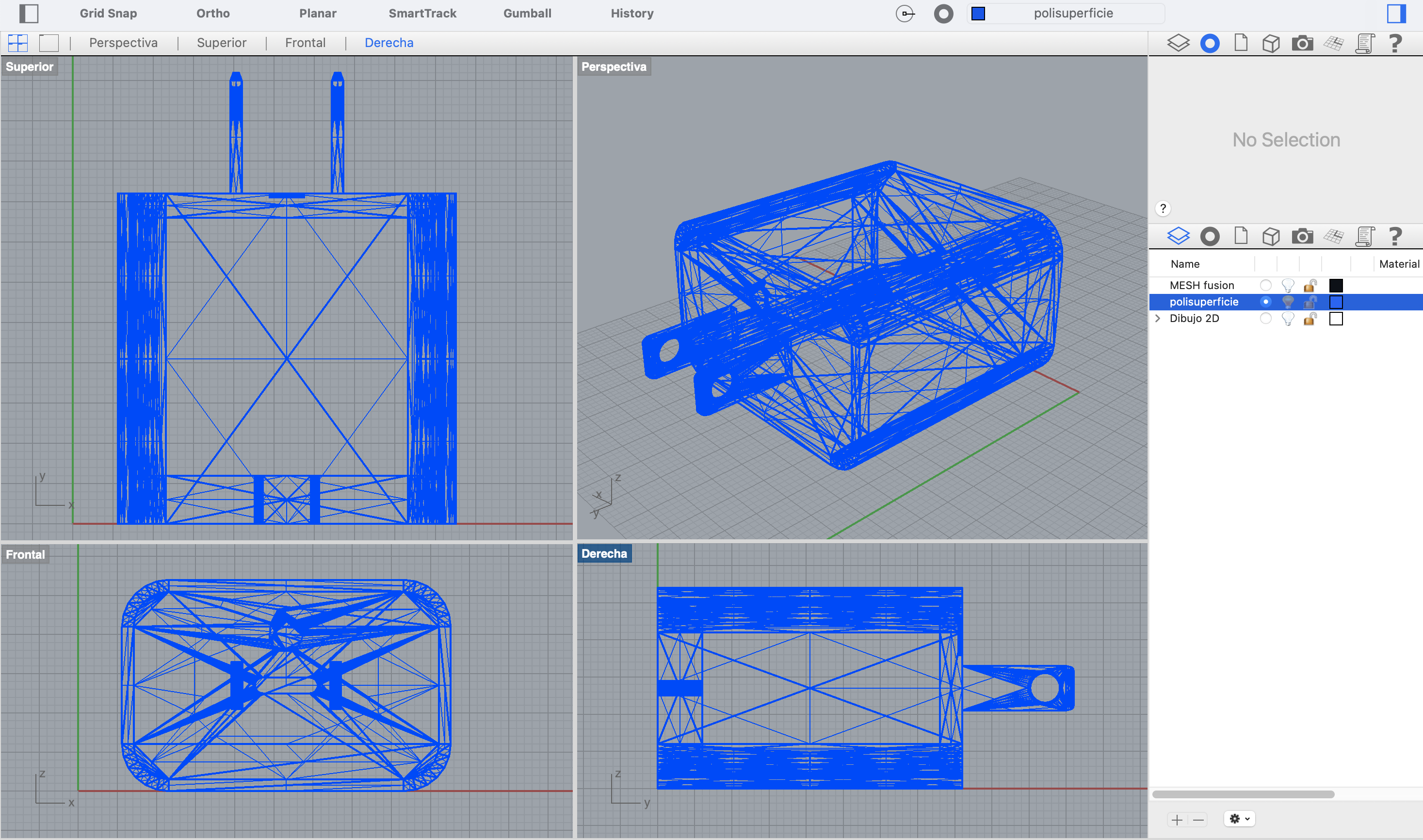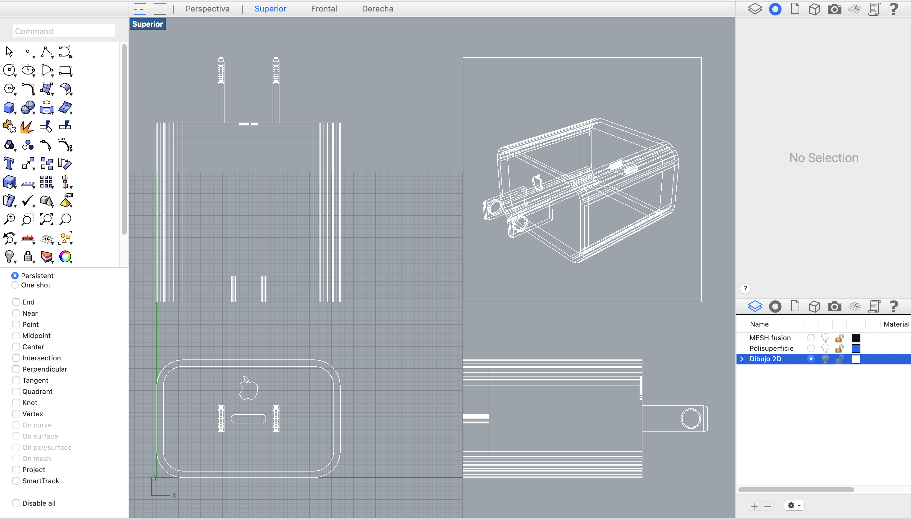 Generación de dibujos 2D (command “Make 2D”) a partir de Modelo 3D (Polisuperficie ~ nurbs). El Dibujo de vistas bidimensional no se genera a partir del modelo en Mesh.